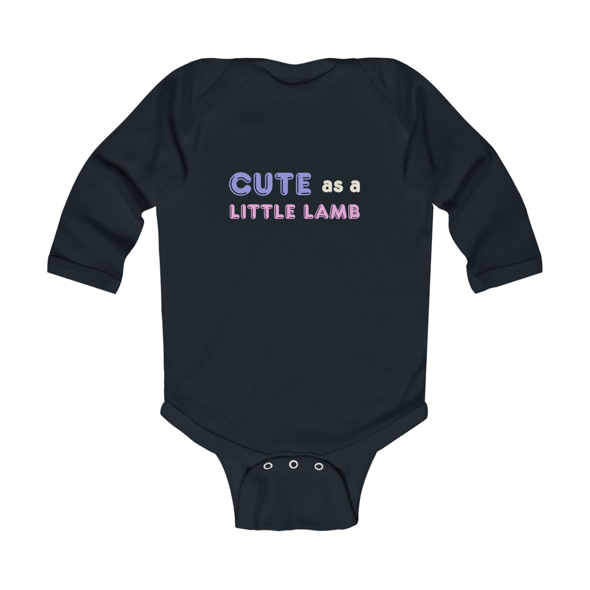 A cute infant bodysuit featuring the phrase 'cute as a little lamb' perfect for when the weather starts to get cold. This long sleeve bodysuit is made from light, soft fabric with rib knit binding for comfort and freedom of movement. Ideal for parents looking for adorable and meaningful clothing for their little ones.